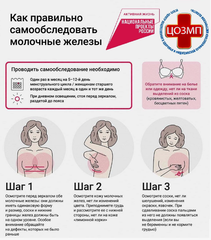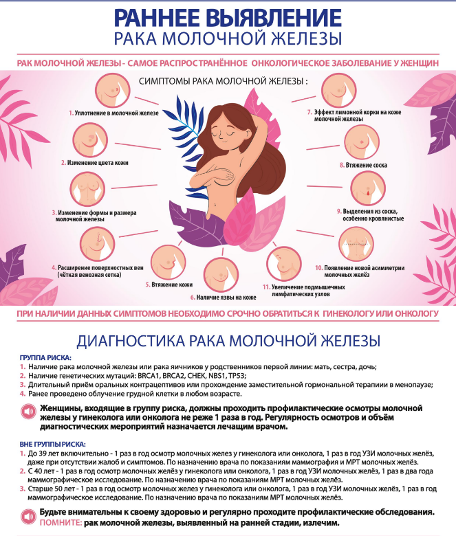 РМЖ – одно из немногих онкологических заболеваний, где самодиагностика чрезвычайно эффективна. Женщина может самостоятельно обнаружить признаки рака молочной железы. Самоосмотр должен проводиться каждый месяц после окончания менструации. Насторожить обязаны: изменение цвета и форма кожных покровов молочной железы, втяжение или локальное углубление кожных покровов, «лимонная корка», втяжение или шелушение соска, выделения из соска, наличие уплотнения в самой молочной железе или в подмышечной области.